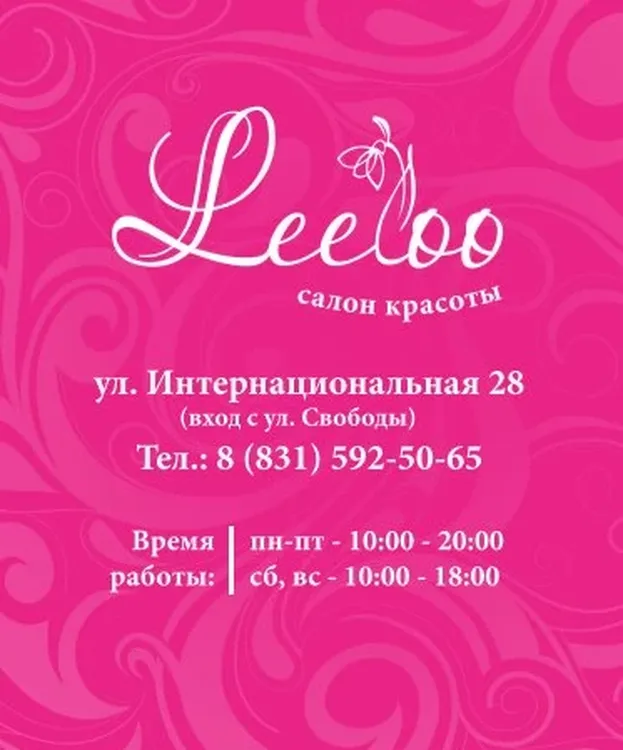 Салон красоты Leeloo – это пространство для тех, кто стремится к совершенству. Мы понимаем, что ваш внешний вид – это отражение вашего внутреннего мира, поэтому мы предлагаем персонализированные услуги для создания гармоничного и стильного образа. Внимание к каждой детали и лучшие специалисты сделают ваш визит незабываемым. Будем рады видеть вас по адресу: Российская Федерация, Нижегородская область, Бор, Интернациональная улица, 28 Предварительная запись по телефону: 78315925065.