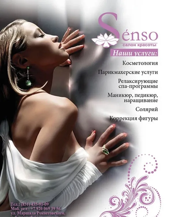Салон красоты Senso – это оазис для тех, кто ценит истинное качество и внимание к каждой детали. Мы предлагаем индивидуальные услуги по уходу за волосами, лицом и телом, используя только передовые техники и высококлассные средства. В нашем салоне вы будете чувствовать себя не только красивыми, но и уверенными. Наш адрес: Российская Федерация, Нижний Новгород, Маршала Рокоссовского К.К., 8 к2 Предварительная запись по телефону: 78314359109.