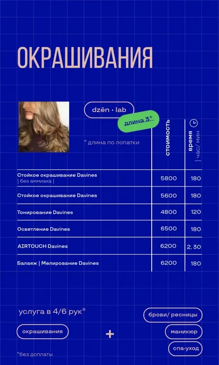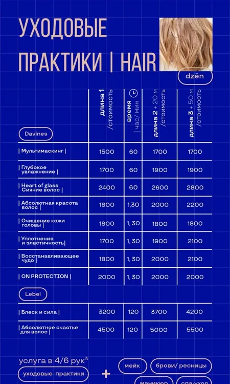 Салон красоты Dzen – это место, где каждая деталь имеет значение. Мы создаем не просто образы, а гармонию, которая соответствует вашим желаниям и индивидуальности. Профессиональные мастера обеспечат вам идеальный уход за кожей, волосами и телом, чтобы вы всегда чувствовали себя на высоте. Наш адрес: Российская Федерация, Воронеж, Комиссаржевской, 13а Предварительная запись по телефону: 79601229966.